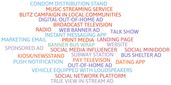 The second campaign was characterized by a combination of production, circulation, and consumption strategies in cross-media [21,22] and trans-media formats [23,24,25]. The main aspect of this campaign was the greater diversity of the means and vehicles of communication, as illustrated by the word cloud in Figure 4, and it was distributed throughout the national territory. The second campaign was a massive undertaking as it was developed for the Brazilian national media and soon had universal coverage on the theme of syphilis. Thus, it is certainly the largest public health communication campaign dedicated exclusively to syphilis in the last 20 years in Brazil.