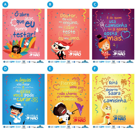 Another significant result of the campaign was the creation of project profiles on the main social networks (Facebook, Instagram, Twitter, and YouTube) and the creation of themed pieces for the Carnival period (Figure 6). Carnival marches (popular songs), historically known in discursive operations of deconstruction and reconstruction, were amended with new verses, whose composition provoked the attention of the target audience to the problem of syphilis. To improve the understanding of the elements in Figure 6, the English translations are as follows: