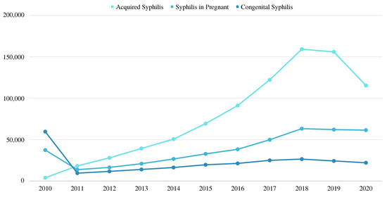 In Brazil, according to official data from the Epidemiological Bulletin of the Ministry of Health of Brazil (MH), in 2020, the incidence rate (per 100,000 inhabitants) of acquired syphilis was 54.5; this rate was 21.6 for syphilis in pregnant women (per 1000 live births); and 7.7 for congenital syphilis in children under one (per 1000 live births) [7]. In Brazil, congenital syphilis became a disease of compulsory notification in 2005, and acquired syphilis reached the same level in 2010 [4].