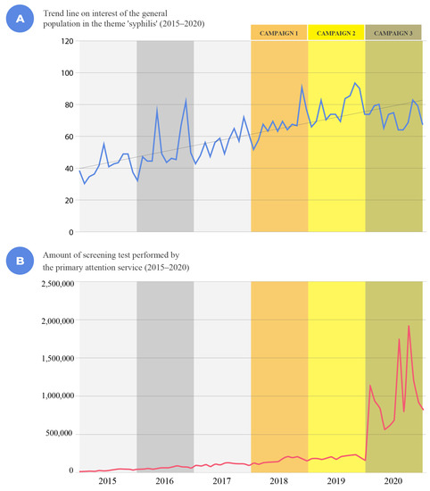 In Figure 9A, the blue line represents searches performed on Google and the dotted line represents the trend in searches performed on Google by the general population. The values shown in Figure 9A are not absolute numbers of searches. Google assigns a value of 100 to the highest number of searches for the month and a proportional value to others. It is possible to see in the graph that there was a large volume of research in the year in which the epidemic was declared in 2016, and the highest volume of searches was in the year in which the communication campaigns developed within the scope of the SNP began, that is, in 2018, 2019, and 2020. The behavior of carrying out internet searches on the topic of syphilis may reflect the feeling of vulnerability [33] that the subject feels when faced with news regarding the need to do something to reduce their degree of uncertainty [30].
