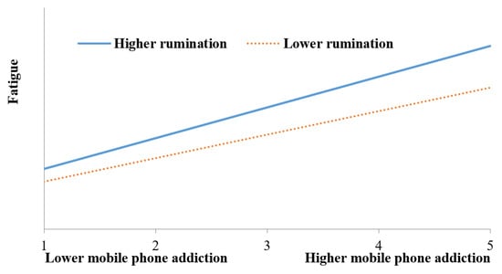 Rumination may accelerate the process of mobile phone addiction, resulting in fatigue. Individuals with high levels of rumination may have poorer sleep quality or sleep disorders when suffering from mobile phone addiction than those with low levels of rumination and thus experience more fatigue. Prior studies have revealed the adverse effect of mobile phone addiction or rumination on individuals’ sleep quality [15,18,60]. According to the main viewpoint of the cumulative model of risk factors [61], the superposition of multiple risk factors (e.g., mobile phone addiction and rumination) will have more serious adverse effects on individuals’ psychological adaptation (e.g., sleep quality). Mobile phone addicts with high levels of rumination not only seriously waste sleep time due to excessive mobile phone use at bedtime but also may be involved in poorer sleep quality or sleep disorders because of their repeatedly ruminating about mobile phone-related activities and experiences before sleeping. Given that poor sleep or sleep disorders were the main cause of fatigue [44], mobile phone addicts with high levels of rumination may have more fatigue due to their poor sleep or sleep disorders after excessive or compulsive use of mobile phones and ruminating more about mobile phone-related activities and experiences in bed. Besides, rumination may strengthen the link between mobile phone addiction and fatigue by catalyzing or amplifying the effects of mobile phone addiction on internalizing problems, such as depression, anxiety, and stress, which are positively associated with fatigue. Previous studies have demonstrated that individuals suffering from mobile phone addiction have more feelings of depression, anxiety, and stress [37,39], and rumination acts as a moderator in this process [53]. Considering that internalizing problems have been proven to be positively correlated with fatigue, the link between mobile phone addiction and fatigue may also be strengthened by rumination.