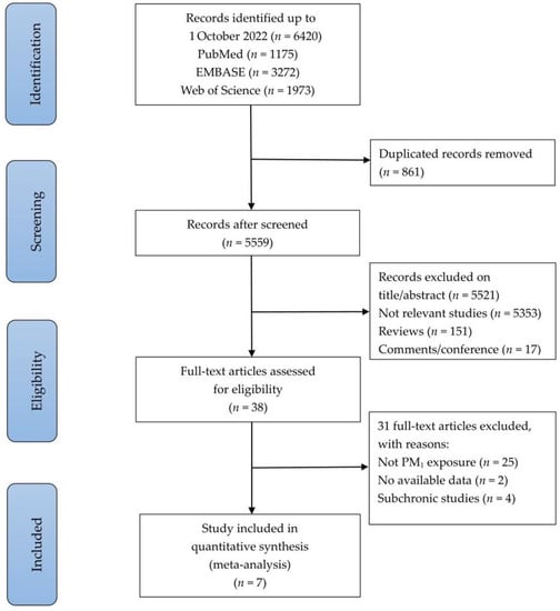 According to the literature search, 6420 studies were identified, 861 duplicates were removed, and 5521 studies were excluded after titles and abstracts reviewed. The full-text evaluation of 31 studies resulted in their exclusion because (1) there were no available data on the effects of PM1 exposure; (2) a lack of adequate lung function indicators or exposure levels; (3) missing data on children or adolescents. Finally, a total of seven studies were included in the systematic review and meta-analysis (Figure 1) [,,,,,,]. A total of three studies investigated the relationship between short-term PM1 exposure and lung function indicators, while four studies examined the relationship between long-term PM1 exposure and lung function indicators. Based on the quality assessment of seven studies, it was determined that all of them scored higher than 7 points, and were deemed to be of high quality (Table 1). More detailed quality assessment was presented in Supplementary Materials, Table S3.