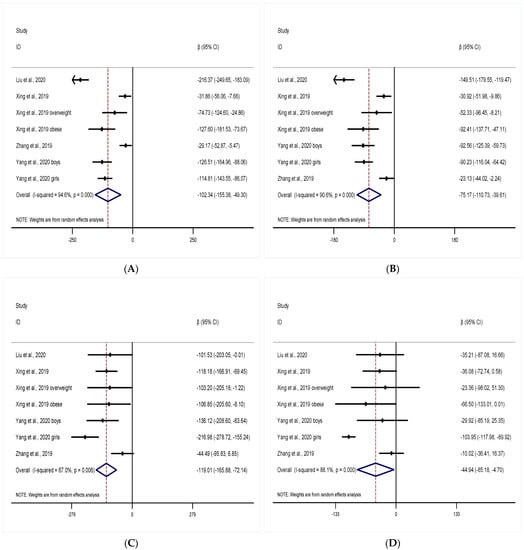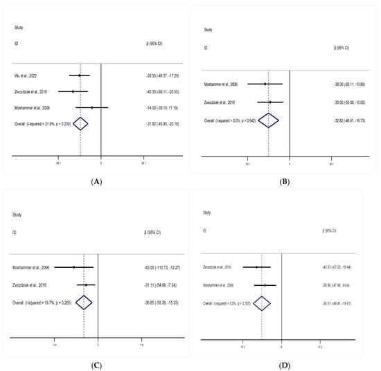 Forest plot of the meta-analysis: per 10 μg/m3 increase of PM1 was associated with pooled β values of lung function indicators in the short-term group: (A) FVC, (B) FEV1, (C) PEF, (D) MMEF [,,]. The open diamonds represent the combined β value for each group. The solid line represents β value = 0.