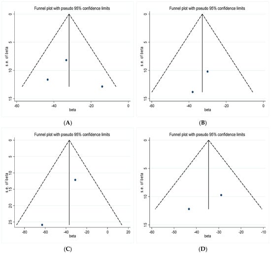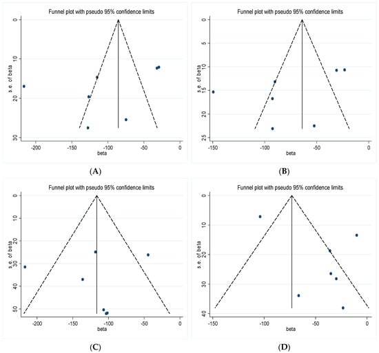 Funnel plot of the effects of PM1 on lung function indicators in the long-term exposure group: (A) FVC, (B) FEV1, (C) PEF, (D) MMEF.