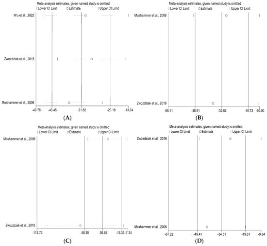 Sensitivity analyses of included studies in the short-term exposure group: (A) FVC, (B) FEV1, (C) PEF, (D) MMEF [,,].