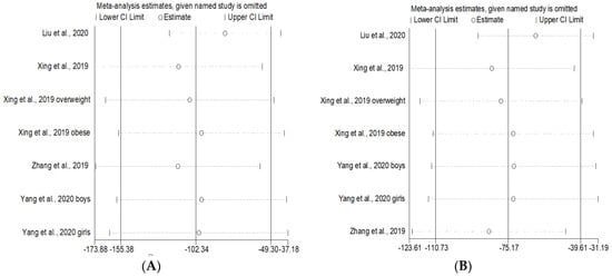 In the meta-analysis, significant heterogeneity was detected in some of the analyzed PM1 and lung function indicator combinations. It is possible that differences in gender, BMI (normal weight, overweight, and obese), influenza vaccination, and breastfeeding may contribute to the observed heterogeneity. As one of the factors potentially influencing lung function, gender plays an important role []. Yang et al. reported that girls had significantly lower lung function levels than boys following long-term exposure to PM1, and that they were more susceptible to it []. Various factors may influence gender differences in lung function in response to air pollution, including differences in the development of the lungs and airways, with males having larger lungs and a larger number and area of alveoli at birth []. Previous research has shown that higher estrogen production in adolescence increases the risk of lung disease in girls []. It has been found that PM1 exposure and obesity have significant interactions with respiratory symptoms and asthma in children []. Increased adipose tissue can produce adipokines, and adipocytes can release cytokines that cause inflammation and oxidative stress, which, in turn, cause the deterioration of lungs [,,,,]. The presence of PM in the blood can also lower insulin sensitivity, promote the dysfunction of β-cells, and stimulate the production of adipokines [,,]. As reported by Liu et al., influenza vaccination may have the potential to moderate the adverse effects of ambient PM1 exposure on lung function of children []. Vaccination against influenza may modify associations in children through mechanisms that are not well understood. There is a possibility that influenza viruses can amplify the negative effects air pollutants have on lung function, resulting in more severe respiratory problems. As a result, influenza vaccination may reduce the risk of co-exposure to influenza and air pollution, thereby providing protection for children [,]. The findings of Zhang et al. indicate that breastfeeding may reduce the incidence of lung function impairments among Chinese children exposed to air pollution, including PM1 []. Compared to bottle feeding or early solid food consumption, breast milk may promote greater pulmonary immune growth and maturation due to its high content of immunological components, including cytokines, chemokines, antibodies derived from the mother, and leukocytes [,,]. One of the most significant benefits of breastfeeding may be that it will postpone the onset of lung infections and diseases, as breast milk contains anti-infective components that can only boost passive immunity and may not provide protection once breastfeeding has ended [].