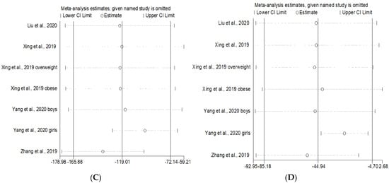 Sensitivity analyses of included studies in the long-term exposure group: (A) FVC, (B) FEV1, (C) PEF, (D) MMEF [,,,].