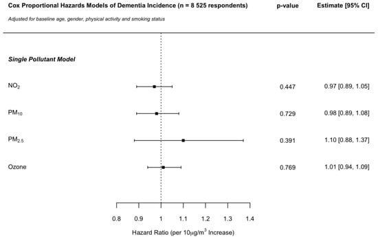 The inclusion of education information as a further covariate to the models described in the main analysis was conducted on a sub-sample of the ELSA cohort data made available to the present study for which such information was viable (n = 3920; 143 dementia cases; Figure 2). The sub-sample comprised individuals that provided 1.18 interviews more on average, in comparison with the main sample, as well as individuals being younger by a mean of 3.75 years. Composition by gender and smoking status was similar between the two samples, with 5.6% more respondents reporting to be “very active” in the sub-sample. Mean baseline pollutant concentrations assigned to individuals were close to identical between the two samples. No hazard ratio (per 10 μg/m3 increase) changed by more than 13% across any of the single pollutant models in comparison with that of the main analysis (Figure 1), with no changes observed in direction of association or nominal statistical significance.