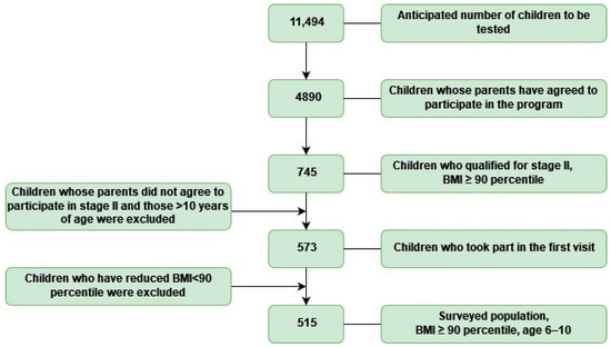 The number of children of the years expected to be examined was 11,494 [7], a figure we obtained from the Szczecin City Hall Ultimately, 4890 Szczecin children were examined during the program—that is why many parents agreed to participate in our project. Eight hundred and twenty-six children were diagnosed as overweight, which accounted for 16.9% of all children examined in schools, while three hundred and thirteen children were diagnosed as obese, which accounted for 6.4%. A total of 23.3% of the children screened were found to be overweight. Due to the social nature of the program, older or younger children who attended the class where the survey was taken, were also examined, so that no child felt left out. For this reason, the study group includes several children younger and older than expected. The statistical analysis included data mainly from 7-, 8- and 9-year-old children and also a total of several 6- and 10-year-olds. For the second stage of the program, 745 children with a BMI ≥ 90th percentile qualified, accounting for 15% of the studied population, including 408 girls and 337 boys. After excluding children who scheduled the first appointment and did not attend and those >10 years old, the group was left with 573 children who attended the first visit. We also excluded those children from this group who, between the first and second stages of the program, reduced their BMI centile to such a degree that they no longer met the eligibility criterion for the second stage, i.e., BMI ≥ 90c (58 children). In the end, during the 3-year course of the study, we analysed a group of 515 children, including 1 child aged 6 years, 148 children aged 7 years, 233 children aged 8 years, 127 children aged 9 years and 6 children aged 10 years—(Figure 1).