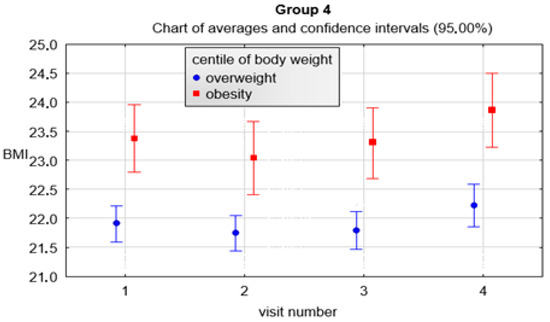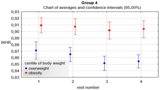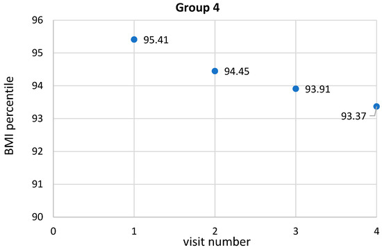 The analyzed group included children who had all specialized visits, i.e., completed the program. As in group two, statistical significance was established for BMI percentile (p < 0.01, R = 0.20) and BMI z-score (p < 0.01, R = 0.17). Additionally, there was a decrease in BMI centile and BMI z-score. BMI remained on the border of statistical significance in this group. In contrast, BMI values between visits 2 and 4 were statistically different p = 0.01. A decrease in BMI percentile was observed from one visit to the next. The highest mean BMI percentile was observed at the first visit and averaged 95.4 ± 2.4, while the lowest was observed at the fourth visit and averaged 93.4 ± 4.6. These data were statistically significantly different from each other (p < 0.01, R = 0.21). Statistical significance was observed between the 1st and 2nd visits (p < 0.01), 1st and 3rd visits (p < 0.01), 1st and 4th visits (p < 0.01) and 2nd and 4th visits (p < 0.01), while the relationship between the 2nd and 3rd visits was on the border of statistical significance. No statistical significance was established between visit 3 and visit 4. Similarly, the z-score BMI also presented a decrease in values from one visit to the next. The highest mean z-score BMI was observed at the first visit and averaged 1.9 ± 0.3, while the lowest was observed at the fourth visit and averaged 1.7 ± 0.4. These data were statistically significantly different from each other (p < 0.01, R = 0.19). Statistical significance was observed between the 1st and 2nd visits (p < 0.01), 1st and 3rd (p < 0.01), 1st and 4th (p < 0.01), 2nd and 4th (p = 0.02). Statistical significance was not established between the 2nd and 4th visits and the 3rd and 4th visits. There was an observed increase in waist circumference in children between the 2nd and 4th and 3rd and 4th visits, which was statistically significant at p = 0.02 and p = 0.04, respectively. In contrast, the observed decrease in waist circumference between the 1st and 2nd, 1st and 3rd and the increase between the 1st and 4th and 2nd and 3rd visits was not statistically significant. An initial decrease in hip circumference and subsequent gradual increase in hip circumference was demonstrated (p < 0.01, R = 0.16). Statistical significance was observed between individual visits 1 and 4 (p < 0.01), 2 and 3 (p = 0.05), 2 and 4 (p < 0.01), 3 and 4 (p = 0.03). Analyzing the WHR values at each visit, there was a slight decrease in WHR values with borderline statistical significance, while statistical significance was found for a decrease in WHR values between visits 1 and 3 (p = 0.03) and borderline for visits 1 and 4. Detailed data showing the anthropometric measurements in the 4th group are shown in Table 7.