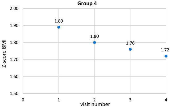 As with the previous groups, the variables of the various parameters were also evaluated in the 4th group. It is noteworthy that the interval between visits gradually increased and was most pronounced in the final part of the program duration, i.e., between the 3rd and 4th visits. The values were statistically significantly different (p < 0.01, R = 0.93). In addition, statistical significance was observed between the 2nd and 3rd visit (p < 0.01), 2nd and 4th visit (p < 0.01), 3rd and 4th visit (p < 0.01). The change in BMI decreased the most between the 1st and 2nd visits but also between the 1st and 3rd visits and increased between the 3rd and 4th visits. These values were statistically significantly different from each other (p < 0.01, R = 0.23). In addition, statistical significance was observed between the 2nd and 4th visits (p < 0.01), 3rd and 4th visits (p < 0.01). The change in BMI percentile decreased between the 1st and 2nd visit, the 1st and 3rd visit, and the highest between the 1st and 4th visit. These values were statistically significantly different from each other (p < 0.01, R = 0.16). In addition, statistical significance was observed between the 2nd and 3rd visit (p = 0.02), the 2nd and 4th visit (p < 0.01), while the change in BMI percentile between the 3rd and 4th visit was on the verge of statistical significance (p = 0.07). The change in the z-score of BMI decreased between the 1st and 2nd visits, the 1st and 3rd, and the greatest between the 1st and 4th. These values were statistically significantly different from each other (p < 0.01, R = 0.17). In addition, statistical significance was observed between visits 2 and 3 (p = 0.02), 2 and 4 (p < 0.01), while the change in z-score of BMI between 3 and 4 was at the limit of statistical significance (p = 0.07). The change in waist circumference decreased the most between the 1st and 2nd visits. There was also a decrease between the 1st and 3rd visits and an increase between visits 1 and 4. These values were statistically significantly different from each other (p < 0.01, R = 0.19). Furthermore, statistical significance was also observed between visit 2 and 4 (p < 0.01) and between visit 3 and 4 (p < 0.01). The change in hip circumference decreased between the 1st and 2nd visits, then an increase was observed between the 1st and 3rd visits and between the 1st and 4th visits. These values were statistically significantly different from each other (p < 0.01, R = 0.27). Besides, statistical significance was also observed between the 2nd and 3rd visits (p < 0.01), between the 2nd and 4th visits (p < 0.01) and between the 3rd and 4th visits (p < 0.01). A slight reduction in the change of WHR index was observed but without statistical significance. Detailed data are provided in Table 8 and Figure 2, Figure 3, Figure 4 and Figure 5.