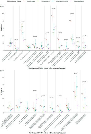 Then, a bivariate analysis was performed focusing on certain specific criteria, selecting the most frequent ones. Significant associations were found in the STOPP PIM criteria related to benzodiazepines (STOPP D5, G5, K1) or ACE inhibitors/angiotensin receptor blockers (STOPP B11), which were significantly higher in the osteoarticular cluster. PIMs related to proton pump inhibitors (extracted from STOPP A1) were significantly lower in the cardiorespiratory cluster than the rest. PIMs involving neuroleptic drugs (STOPP K2) were most prevalent in patients of the psychogeriatric cluster and least prevalent in those of the cardiorespiratory cluster (Figure 1A, Table S4).