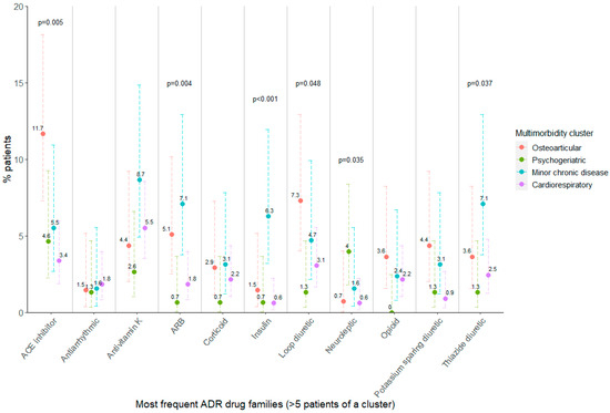 Percentage of patients per cluster having at least one ADR registered in the most frequent drug families. Fisher’s exact test p-value is shown when p < 0.05. ADR: adverse drug reaction; ACE: angiotensin-converting enzyme; ARB: angiotensin II receptor blocker. Error bars show 95% confidence interval for the estimated proportion.
