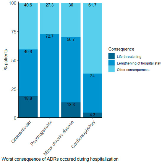Finally, the relationship between multimorbidity cluster and the consequences of ADRs during admission was also tested, and a significant association was found (Figure 3; Fisher’s Exact Test: p-value = 0.02). For example, 18.8% of patients in the osteoarticular cluster who suffered an ADR during admission faced a life-threatening situation, whereas this did not happen to any patients in the psychogeriatric cluster. Nevertheless, in the psychogeriatric cluster, most ADRs caused a lengthening of hospital stay. None of the ADRs were fatal.