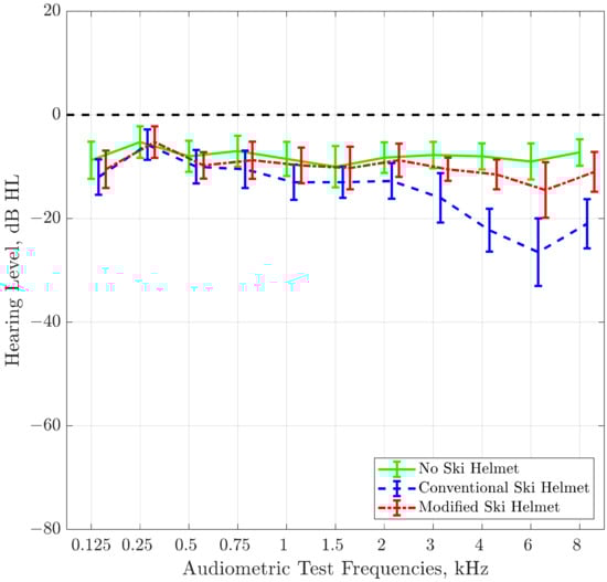 Hearing thresholds of subjects were determined in each of the three conditions (no ski helmet, conventional ski helmet, modified ski helmet) were averaged over subjects.