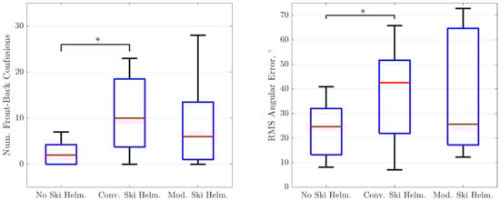 The medians of the root mean square (RMS) angular error of the sample are shown in Figure 3, right panel, for the three test conditions. The smallest median angular error was observed in the “no ski helmet” condition (24.7°), closely followed from the one in the “modified helmet” condition (25.7°). In the “conventional ski helmet” condition, the median angular error was as large 42.6°.