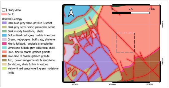 Geological map of the study area, extrapolated from Bedrock Geology map (scale 1:100,000) of Geological Survey Ireland (GSI).