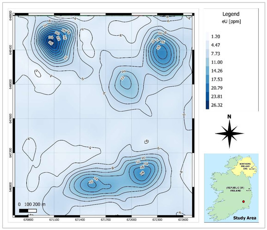 Rainfall and precipitation are among the important events that can change near-surface environmental gamma rates by affecting radon progenies 214Pb and 214Bi [39]. Furthermore, water accumulation in the surface soil may act as a shield and prevents radon emission. The accumulation of radon in a stable boundary layer can also have a considerable influence on gamma levels [40]. Moreover, hydrological movement at sites with high radon fluxes may represent a source of false alarms regarding radioactivity levels [41]. As mentioned in Section 2.1, the equivalent uranium concentrations measured in the frame of the Tellus project are estimated from the 214Bi photoelectric peak. Knowing the fact that rainfall events, precipitation or other meteorological parameters can highly affect the detection results of airborne gamma-ray spectrometry, and also considering that Ireland is a country in which rainfall and precipitation are frequent and soils can be saturated during wet seasons, it would be necessary to perform radon background correction for airborne gamma-ray spectrometry results to improve the accuracy of measurement and avoid false estimates of radon anomalies [42].