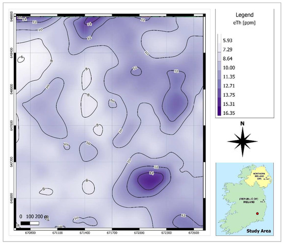 Ideally, a GRP estimation is derived from radon soil gas concentrations [22]. An alternative method to detect radon on the ground is to use airborne gamma spectrometry [18,23]. In Ireland, there are insufficient SGR data to generate useful radon potential maps. However, airborne radiometric data provided by the Tellus project are available in a high resolution for most of Ireland (http://www.tellus.ie, accessed on 30 May 2021). The airborne radiometric survey was carried out using a low-flying aircraft (flying at 60 m in rural areas and 240 m in urban areas). The data were recorded by a 256-channel gamma spectrometer (Exploranium GR820) covering 0.3–3 MeV [24]. They were integrated over flying distances of about 50 m. Potassium (40K), equivalent uranium (eU, estimated from 214Bi) and equivalent thorium (eTh, estimated from 208Tl) were measured in these surveys.
