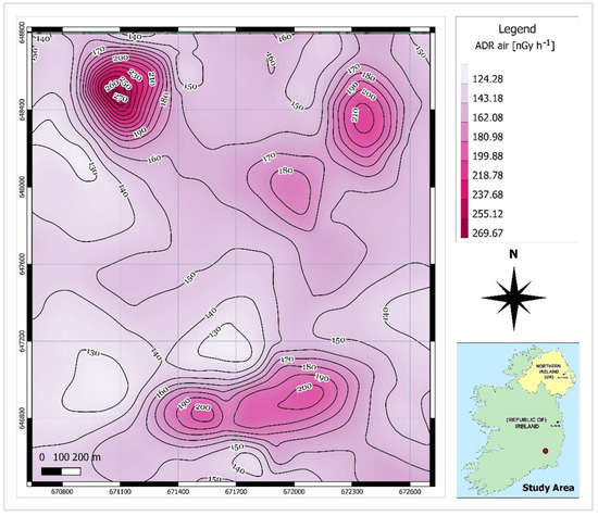 SGR values ranged between 6 kBq m−3 and 236 kBq m−3 with a mean value of 88 kBq m−3 which is a significantly high value even for an area with a granitic bedrock. The equivalent activity of uranium and thorium ranged from 2.42 to 17.37 ppm and from 7.53 to 13.54 ppm, respectively. The calculated mean value of eU (5.39 ppm) is slightly higher than the average value of uranium in U- and Th-enriched granitic rocks (5ppm for U and 15 ppm for Th [35]). However, the mean calculated eTh (9.63 ppm) was considerably lower than the average Th content in the granite rocks. The mean air-absorbed dose rate measured for the study area is almost 2.5 times the population-weighted average absorbed dose rate of 60 nGyh−1 in outdoor air from terrestrial gamma radiation [36]. Comparing the contour maps of eU and air-absorbed dose rates (Figure 3 and Figure 5, respectively), it can be understood that high dose rates occurred in the areas where eU concentrations are high. This means that uranium anomalies present in the area (northern and central south sectors) may be responsible for higher dose rate values.