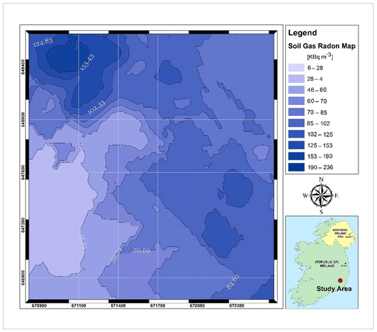 Tellus airborne radiometric data provide valuable information about natural radioactivity (gamma radiation) of near-surface rocks and soils using a gamma-ray spectrometer. The data have many applications in environmental monitoring and geological mapping. As an example, the estimated natural radionuclide concentration of uranium, thorium and also the air-absorbed dose rate can be used as an indicator of the presence of a radon (including thoron) source. In this research, to prepare a geogenic radon potential map, radiometric data were used in combination with geogenic factors which account for radon mobility and transport from the source to the ground level. Airborne radioelement concentrations (i.e., eU and eTh), air-absorbed dose rate, distance from the major fault, soil permeability and a digital terrain model were assumed as the main predictors and soil gas radon was considered as the response value of an ordinary least squares regression model. Through diagnostic tests, the validity of the developed model was evaluated. At the later stage, empirical Bayesian kriging, an interpolator tool, was used to produce the geogenic radon potential maps and estimate the uncertainty of predictions. The method introduced here can be considered a promising tool to produce GRP maps for other regions, especially in Ireland. Moreover, it is possible to improve the model by considering the effect of additional parameters (e.g., water content of the soil) for which there are valuable literature data in Irish databases. For this research, it was not possible to integrate this information as the selected study area was relatively small, making it incompatible with the resolution of the data. Finally, according to the standardised regression coefficients of the explanatory variables (Figure 7), permeability was found to be the second most effective parameter in predicting soil gas radon activity; hence, it strongly affects GRP levels. As observed here, the soil permeability can be very spatially variable even for intervals of tens of meters. Therefore, it is suggested to use data on in situ permeability measurements rather than indirect estimations for radon mapping purposes.