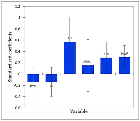 To avoid using variables that may cause instability in the model, multicollinearity was tested through the Variance Inflation Factor (VIF) statistic before setting the regression model. As shown in Table 2, the VIF value did not exceed the recommended value of 7.5 for any of the explanatory variables. The result of the regression model analysis (Table 2) states that the variables eU, eTh and Log P bring a significant amount of information to explain the variability in the dependent variable (SGR). However, the variables DTM, DF and ADRair are not consistently significant. Figure 7 shows the chart of standardised regression coefficients of the model. The chart allows us to directly compare the relative influence of the explanatory variables on the dependent variable and their significance. The higher the absolute value of a coefficient, the more important the relative influence of a variable is. It can be concluded that among the significant variables, Log P and eU are the most influential ones. This can be explained by the fact that these two parameters mainly control the source of radon (as uranium is the parent of radon) and also the mobility of the gas toward the surface, therefore having influence was anticipated for them. For more detailed results, please see Appendix A.