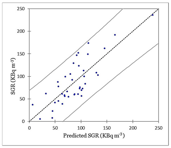 where SGR = soil gas radon concentration (kBq m−3), ADRair = air-absorbed dose rate (nGyh−1), Log P = permeability of the soil (m2), eTh = equivalent content of thorium (ppm), DTM = digital terrain model (m a.s.l.), DF = distance from the major fault (m) and eU = equivalent content of uranium (ppm).