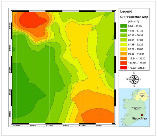 In the previous sections, the relationship between radon-related variables and the soil gas radon concentration was obtained. The geogenic radon potential (i.e., the quantity of radon directly related to the local geology) is defined as the soil gas radon values predicted based on the regression equation which calculates SGR solely based on predictor variables. To produce the map of the spatial distribution of GRP for the study area, the empirical Bayesian kriging (EBK), an automatic geostatistical interpolator, was used in ArcGIS version 10.5 software. This tool creates prediction surfaces based on restricted maximum likelihood estimation. Additionally, it allows for analysis of the uncertainty in the semivariogram model by a process of data sub-setting and simulation to estimate a range of semivariogram models [37].