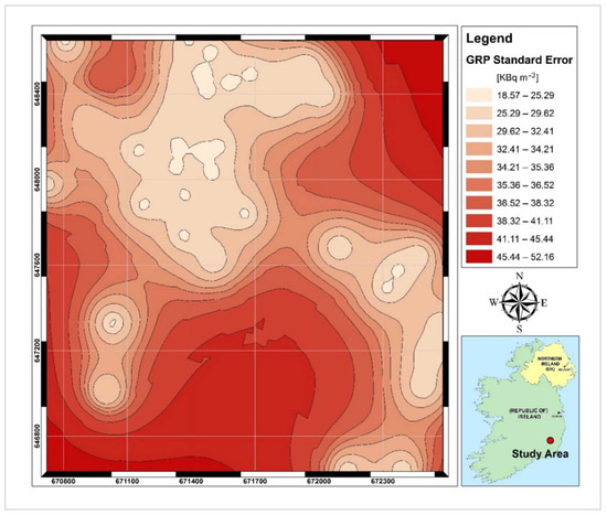 The GRP surface predicted based on the soil gas radon concentrations is shown in Figure 9, along with its corresponding predicted standard error surface, which illustrates the amount of uncertainty associated with the predicted SGR value. As shown in Figure 9, high GRP values (>85 kBq m−3) can be found in the eastern and northwestern sectors of the study area. Just for the southwestern part, the GRP is in the low range (50 kBq m−3) and the remaining parts are characterised by medium GRP levels (50 to 85 kBq m−3). The uncertainty in GRP prediction shown in Figure 10 is generally in the low to medium range (less than 35 kBq m−3); however, for areas along the borders of the study area, rather high values (up to 52 kBq m−3) can be predicted. A possible source of error in those areas would be an insufficient number of SGR test points that occurred due to sampling limitations (i.e., presence of saturated soil and improper site access).
