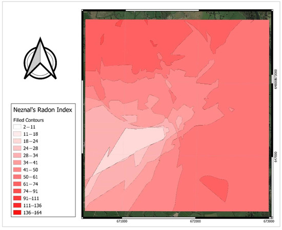 Figure 12 shows the distribution of calculated radon index values produced using the nearest neighbour interpolation method. Similar to the map of predicted radon potential in Figure 9, areas with high geogenic radon risk are located within the northwest and southeastern confines of the study area. Although among the scientific society, Neznal’s method has been proven to be an acceptable approach to formulate the radon potential, it is based on soil gas radon concentrations and permeability alone. Here, we apply a well-recognised and robust spatial regression model where a set of effective parameters are introduced as inputs to map radon potential [13]. We see the two approaches as complementary in nature, with the advantage that the spatial regression model includes a greater number of variables to define areas of geogenic radon potential.