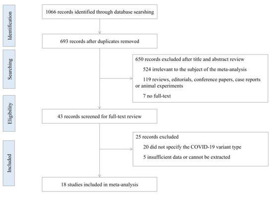 As part of the initial literature research, 1066 potential articles were identified up to 14 August 2022, including published articles (184 in PubMed, 160 in Embase, 483 in Web of Science, 76 in ScienceDirect) and 163 preprinted articles (43 in bioRxiv, 120 in medRxiv), and 373 duplicates were excluded. After reading the titles and abstracts, 650 articles were excluded based on the inclusion and exclusion criteria. Among the 43 studies under full-text review, 25 studies were excluded. Eventually, 18 studies (including 17 published articles and 1 preprinted article) were included in this meta-analysis based on the inclusion criteria. The literature retrieval flow chart is shown in Figure 1.