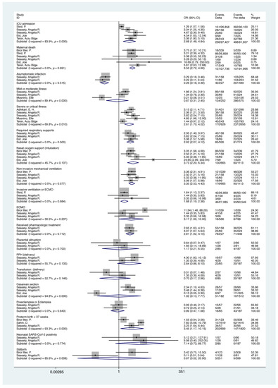 Forest plot of maternal and perinatal outcomes of Delta or pre-Delta SARS-CoV-2 variant infections during pregnancy. NOTE: Weights are from random effects analysis.