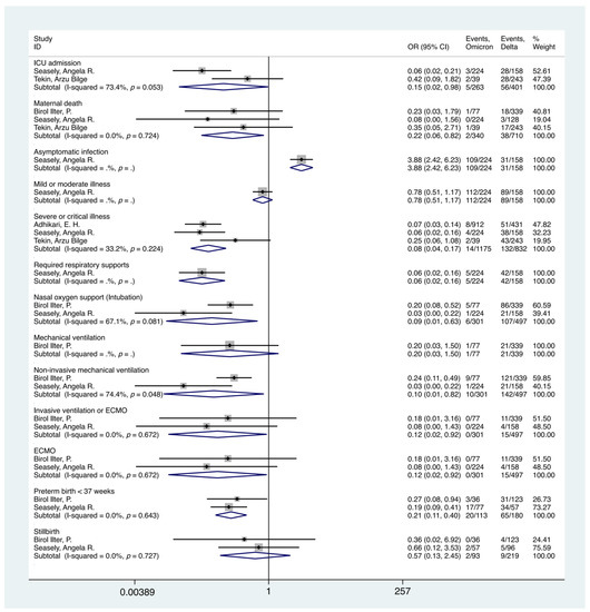 - Seasely, A.R.; Blanchard, C.T.; Arora, N.; Battarbee, A.N.; Casey, B.M.; Dionne-Odom, J.; Leal, S.M.; Moates, D.B.; Sinkey, R.G.; Szychowski, J.M.; et al. Maternal and Perinatal Outcomes Associated With the Omicron Variant of Severe Acute Respiratory Syndrome Coronavirus 2 (SARS-CoV-2) Infection. Obstet. Gynecol. 2022, 140, 262–265. [Google Scholar] [CrossRef] [PubMed]
