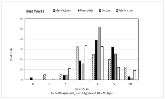 Table 3 shows the answers given by doctors (general practitioners or primary care physicians, that is, human health care professionals who work within the Italian national health system). By analyzing the mean averages shown in the table, we can see that for the MD listed, the highest percentage of doctors gave a score of “4” on the priority scale (20.8%), which can be translated as strongly agreeing with what is stated in the question. This can be broken down by potential health effect: skin MD had the highest mean average, with 23.52% receiving a score of 4, followed by ophthalmic MD (21.05%) and finally otorhinolaryngological MDs (20.26%). For this professional category, the percentage of “no reply” responses (NR) was very significant (37.1%).