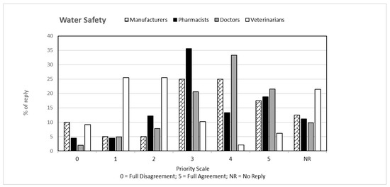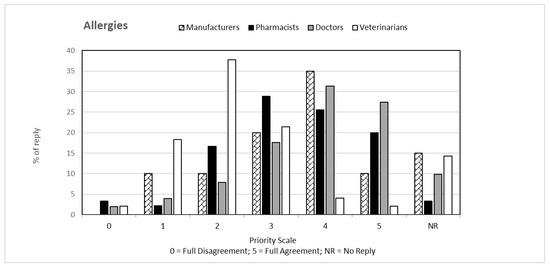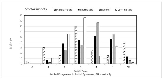 Table 4 shows the answers given by veterinarians (animal health care professionals). By analyzing the mean averages shown in the table, we can see that for the MD listed, the highest percentage of veterinarians gave a score of “4” on the priority scale (2.8%), which can be translated as strongly agreeing with what is stated in the question. This can be broken down by potential health effect: skin MDs had the highest mean average, with 4.28% receiving a score of 4, followed by ophthalmic MDs (21.05%) and finally those for pediculosis treatment (2.4%). Unfortunately, for this category of professional, the percentage of “no reply” responses (NR) is even higher than the two previous categories (89.0%).