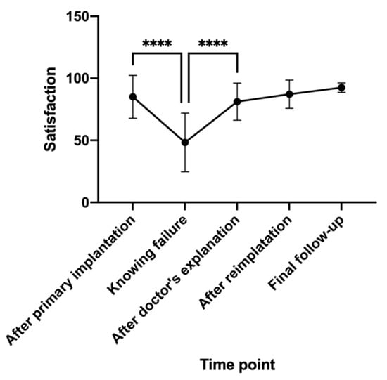 Without a complex questionnaire design, the VAS method allowed patients to recall their overall satisfaction at key time points from the primary implantation without deep consideration, and they could write on the VAS scales to present the level of satisfaction with the least amount of recall bias. Interestingly, the mean satisfaction of the 18 reimplanted patients dropped from 85.1 ± 17.3 post-primary implantation to 48.3 ± 23.6 when they knew the implant failure had occurred, but the mean score soared back to 81.2 ± 15.0 after the implantologist’s meticulous explanation and comfort, with both changes showing statistical significance. Then, the satisfaction level remained over 80 with slight increases after the reimplantation and successful restoration. This dramatic development indicated that implant failure did largely influence the patient’s satisfaction with the implant treatment, but it can be reversed by the implantologist’s explanation, and most essentially, successful reimplantation. Since the failure of surgical procedures can have a significant psychological impact on patients [