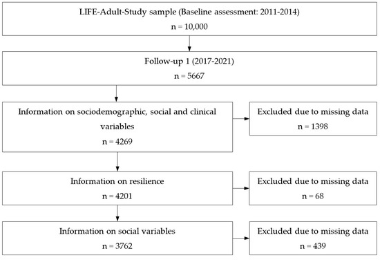 Data derived from the LIFE-Adult-Study, a population-based cohort study conducted in the city of Leipzig, Germany [36,37]. Resilience was assessed for the first time in the follow-up assessment, so we used data from n = 5667 follow-up participants for the cross-sectional analysis of the relationship of resilience with mental health. The follow-up assessment was conducted between October 2017 and December 2021. As shown in Figure 1, we had to exclude participants due to missing information on sociodemographic, social, and clinical covariates of our analyses (n = 1398). Next, n = 68 participants were excluded due to missing information on resilience. We further excluded n = 439 participants due to missing information in the mental health variables, resulting in a final sample of n = 3762.