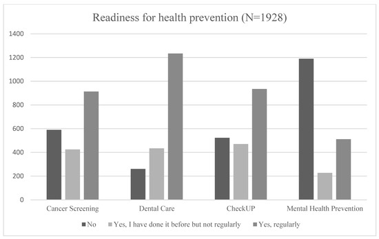 Readiness for health prevention in different medical fields (cancer screening, dental care and check-ups are regular precautionary offers; mental health prevention was asked as a hypothetical offer).