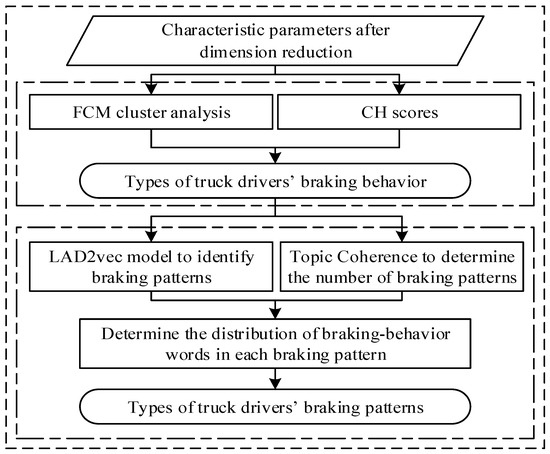 In summary, a framework model for recognition of truck drivers’ braking patterns was proposed based on the FCM algorithm and LDA2vec model (see Figure 1). Additionally, the FCM clustering algorithm was used to analyze the types of braking behaviors from the related fragmented data, and the LDA2vec model was used to mine the distribution of braking patterns in the braking data and the distribution rules of braking behaviors in the braking patterns.