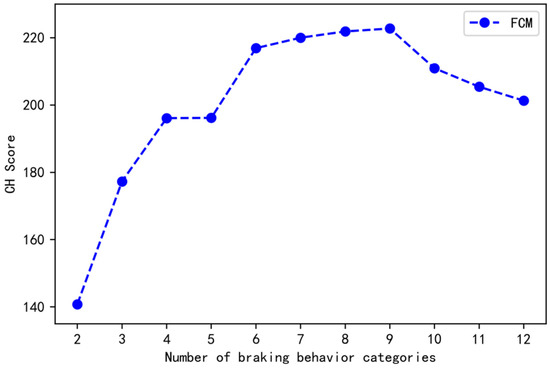 In the cluster analysis process of the FCM algorithm, some categories need to be determined first. Calinski-Harabasz (CH) scores can be calculated by using the function in Scikit-learn, which is more efficient [21]. Therefore, the CH score index was selected to evaluate the clustering results of truck drivers’ braking behaviors. The ideal clustering effect is as follows: smaller covariances are suitable for the data within a category, while larger covariances fit the data between categories. Therefore, the larger the CH score, the better the clustering effect.