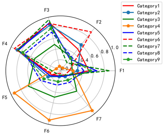 Figure 5 shows the radar chart of cluster center analysis in the nine categories. The boundaries for classifying the cluster centers between parameters are relatively clear, and the boundaries of the cluster center values between the categories are distinct. Thus, it is feasible to cluster the braking behaviors of truck drivers into nine categories.