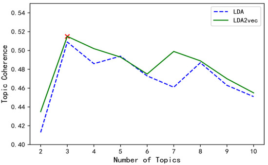The topic number of truck drivers’ braking patterns is determined using topic coherence. The higher the correlation between words within the same topic, the better the classification effect, so the higher the topic consistency score, the more suitable the number of topics corresponding to the topic consistency indicator as the number of categories in the truck driver’s braking mode. The LDA and LDA2vec models are used to identify the truck driver’s braking patterns (see Figure 6 for their respective topic coherence scores). In Figure 6, whether it is in the LDA model or the LDA2vec model, the topic coherence score is the maximum when the number of topics is three. Therefore, the three classes of the truck drivers’ braking patterns are selected.