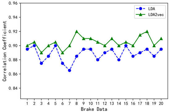 Combined with the distribution of braking patterns and braking behavior words in the braking data, that is, the training results of the two models, the braking data are reconstructed. Correlation analysis is performed between the reconstructed and original braking data (see Figure 7 for correlation coefficients). The correlation coefficient of the training results based on the LDA2vec model was higher than that based on the LDA model, indicating that the distribution of the braking pattern and braking behavior words in the braking data in the LDA2vec model was more consistent with the distribution in the original data. The LDA2vec model has more advantages than the LDA model for identifying the truck drivers’ braking patterns.