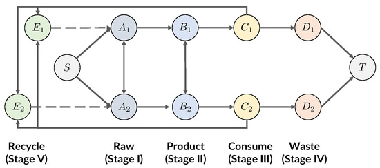 - First, we define n “production” edges from a source node S to every , with cost being small and capacity depending on the countries’ capacity to produce raw plastic materials. Then, we define “trade” edges between and , with cost being small and capacity depending on the export limit of raw plastic materials from country i to country j.