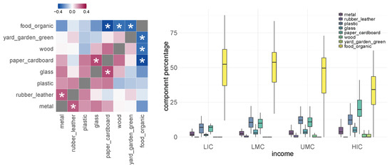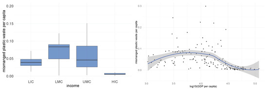Specifically, plastic waste shows nominally significant positive correlation with paper or cardboard waste (p-value = 0.02). In the right graph of Figure 3, we divide countries into four income levels: low income (LIC), lower-middle income (LMC), upper-middle income (UMC), and high income (HIC) and show the association between income level and the proportions of different kinds of waste. In particular, the proportion of plastic waste in low-income countries is significant less than those of other countries (t test p-value = 0.002), relating the structure of waste generation to country income. We did not observe significant association between the plastic waste as the proportion of total waste and import/export status of the countries, as shown in Appendix A—Figure A1.