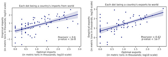 From Figure 8, it can be seen that the real-world empirical patterns positively correlate with the model-created optimal trade patterns (imports from the world and exports to the world for each country). The distances to the optimal trade pattern for most of the countries are actually small (Appendix A—Figure A3). Assuming the model-created pattern is optimal as a “ground truth”, the stronger the correlation is, the empirical trade flows are better. This allows us to define a metric to evaluate a given trade flow: