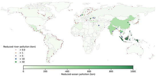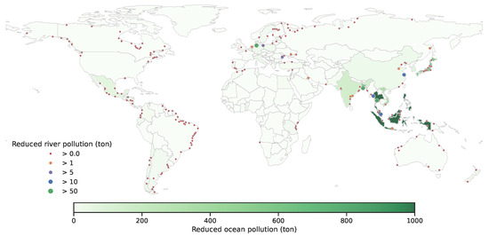 For each country, the total amount of plastic waste is , and we multiply the MMPW factor for each country to obtain the MMPW in each country. For total pollution in oceans by each country, we multiply per-country MMPW with the probability that MMPW will be emitted to oceans from [13]. For pollution in individual rivers, we use the river pollution model in [14,15] which accounts for both macroscopic and microscopic plastic; we take the sum of both types to estimate the pollution from each river, which is estimated to be linear to the total population surrounding the river times the MMPW per person around the river. These data are then used to produce the world map plots that show improvements in ocean pollution, river pollution, and MMPW in general.