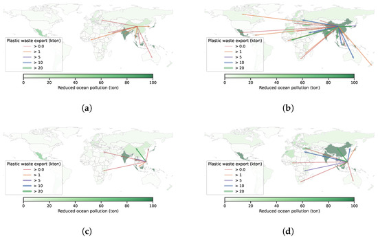 Export of China and Philippines’ plastic waste under different policies on global plastic waste trade. (a) trade, China. (b) more trade, China. (c) trade, Philippines. (d) more trade, Philippines.