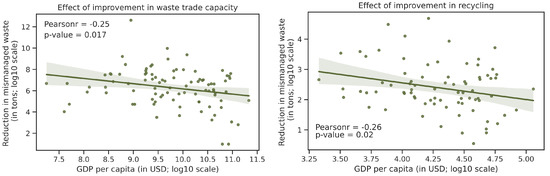 We then test the effect of recycle rate on reducing pollution. We uniformly increased the recycle rate by 10% relative to a baseline model. It is not surprising that a better plastic recycling system should help with the pollution problem. Interestingly though, we observe a clear negative correlation between the ocean pollution reduction and GDP per capita across countries (Figure 12), and a similar pattern also exists with the previous trade limit strategy. This suggests that there is more space for improvement in developing countries, where the recycling management system is still largely under-developed [18]. Appendix A—Figure A6 and Figure A7 display the anticipated pollution reduction from increasing the recycle rate on a geographical map. This heterogeneity also suggests that some countries have larger policy levers. For instance, because China is the largest developing country, improvement in recycling rate in China alone can significantly reduce global ocean plastic pollution, compared to developed countries and small developing countries, consistent with previous studies [9,19].