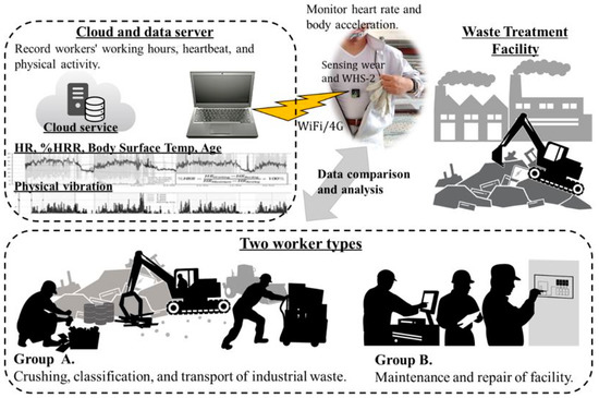 Waste management facilities are mainly involved in processes such as crushing, sorting, compacting, and incineration. In areas where automated operations are difficult, waste work can be labour-intensive and dangerous. The Japan Construction Occupational Safety and Health Association (JCOSHA) regulates safety management efforts in the manufacturing and construction industries [6]. In labour-intensive industries such as construction, efforts are made to improve the sophistication of safety management using information and communication technologies for process refinements, such as abnormality detection and maintenance related to processes and equipment [7]. They monitor workers’ bio-information and behaviour, analyse risk, and evaluate the practicality of education and training. The use of information and communication technology in safety management is expected to improve the waste management working environment, which enhances the working conditions, quality of life, and health of workers, thereby ultimately reducing the industry’s impact on public health by contributing to environmental sustainability [1].